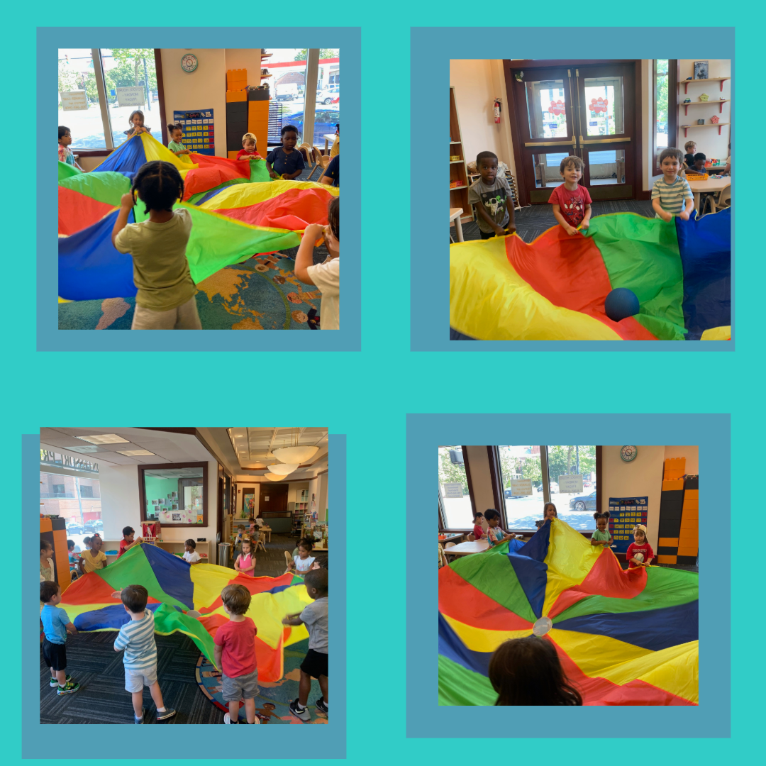 Our stars worked together to shake the parachute like a roaring crowd, bounced a soft ball high into the air, and practiced taking turns running underneath as the parachute floated down. The giggles were non-stop, and so was the learning!