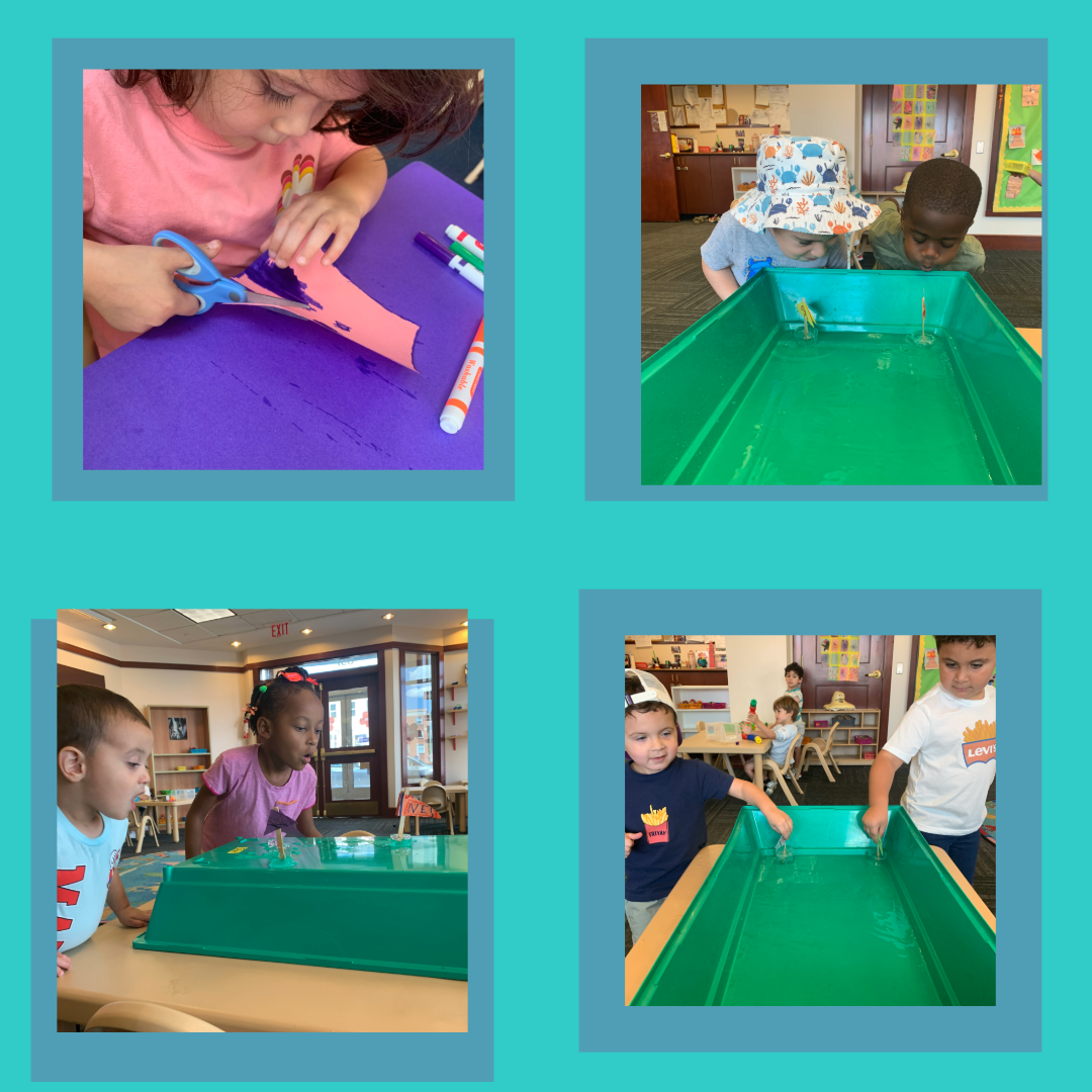This morning, the real fun began! Each child decorated a paper sail with markers and attached it to their boat. Then we headed outside to race our frozen boats and watch them glide across the water table.